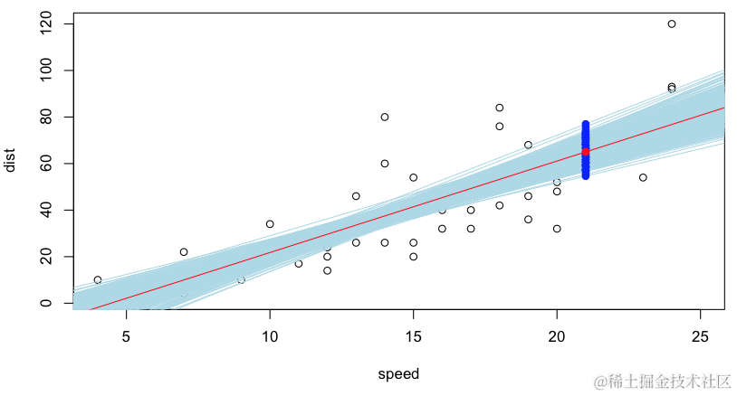 points(x,predict(reg,newdata=data.frame(speed=x)),pch=19,col="blue")