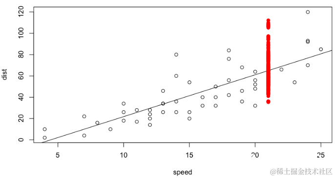 > points(x,predict(reg,newdata= data.frame(speed=x)),pch=19,col="red")