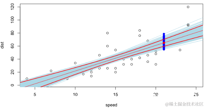 蓝色值是可能的预测,可以通过在我们的观察数据库中重新采样获得。残差(以及因此的斜率和回归线的常数的估计值)的正态性假设下的置信区间(为90%)如下