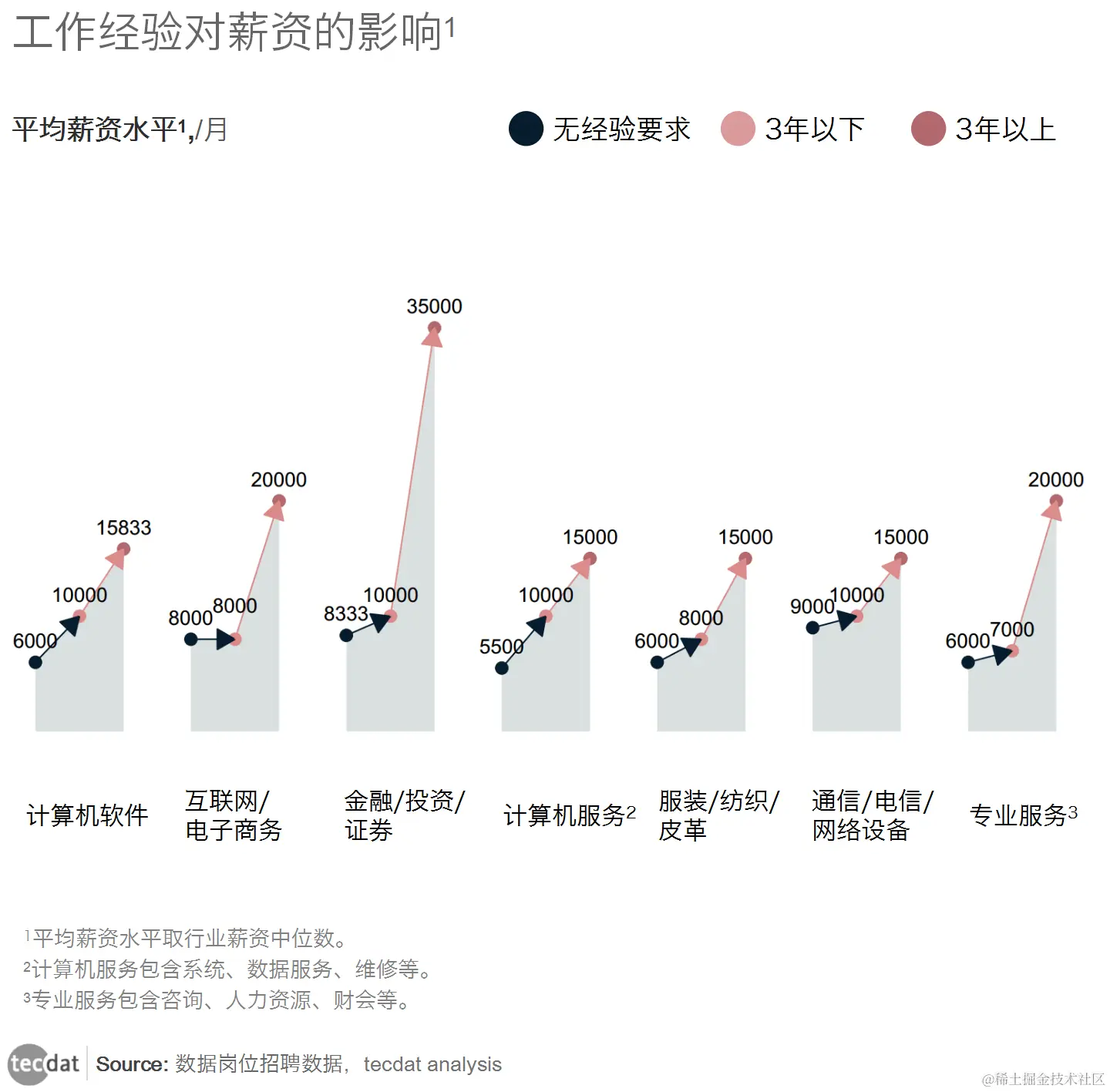 从中工作经验越丰富,薪资越高。大部分岗位要求有工作经验的,主要集中在3-5年,其次是1-3年的。应届生平均工资最低,平均在7、8k,最高的是金融/投资/证券5年以上,达到35k的工资。金融/投资/证券、互联网、电子商务和专业服务行业,3年以上的薪资相对于3年以下有较大提升。计算机软件、计算机服务、通信和服装等行业随着工作经验的增加,工资有稳定增长趋势。