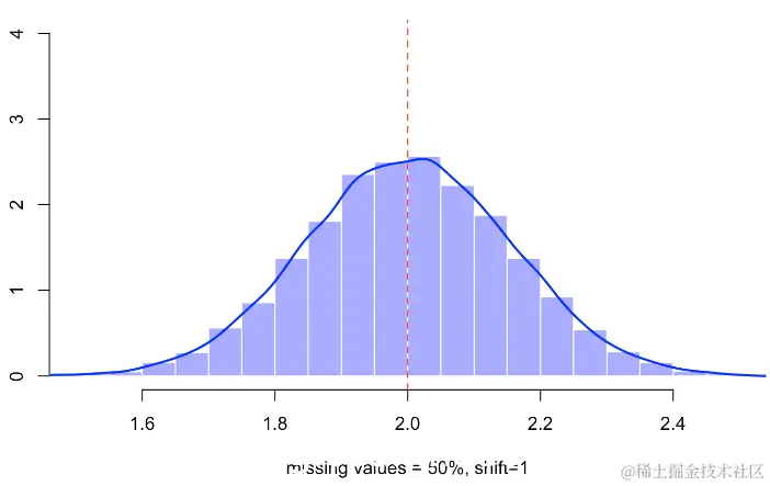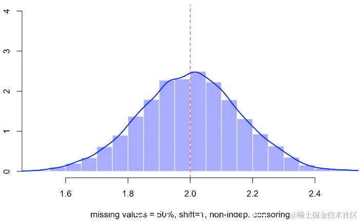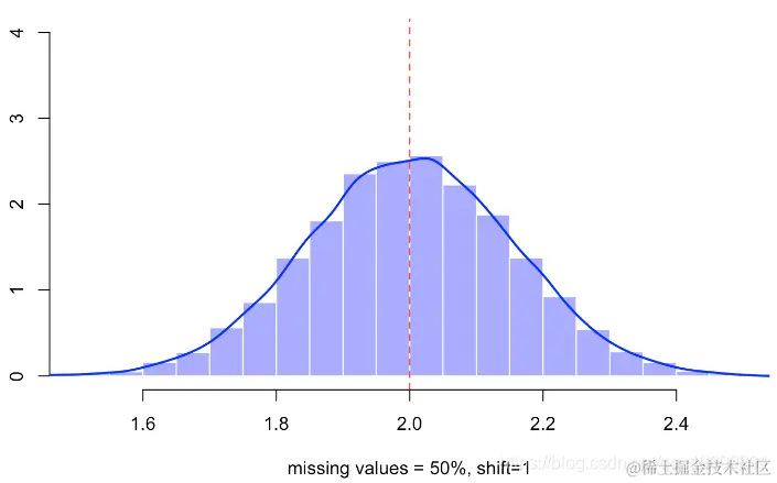 hist(B,probability=TRUE,col=rgb(0,0,1,.4),border="white",xlab="missing values = 50%")