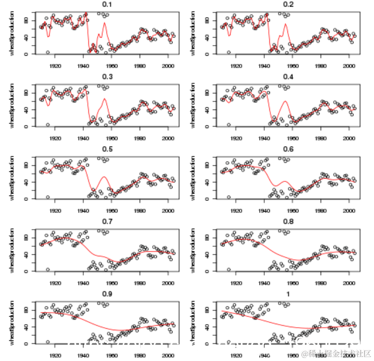 为了说明,我们考虑由来自1910至2004年的小麦产量数据集 。