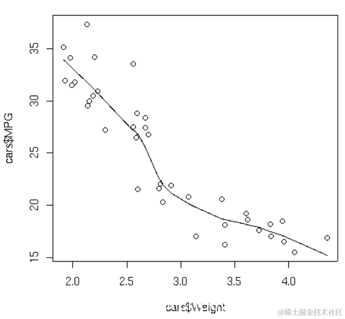 为了说明这一点,考虑汽车数据。以下几行产生了 重量 与 MPG的关系图,并叠加了一条超平滑线。