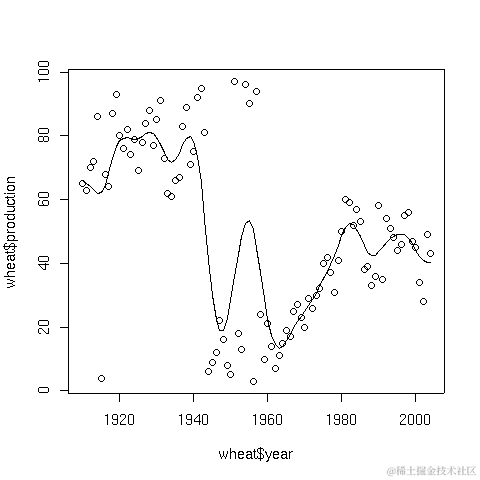 > lines(smooth.spline(wheat$year,wheat$production))