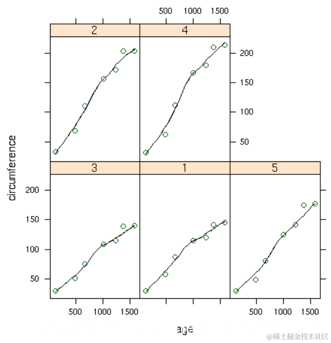在使用点阵图形时,我们已经看到了 panel.lmline 的使用 ,它在点阵图的每个面板中显示最佳回归线。可以使用类似的函数 panel.loess 在图的每个面板中叠加局部加权回归平滑器。作为简单说明,考虑内置的 Orange 数据集,其中包含有关几棵橙树的年龄和周长的信息。首先,让我们看一幅具有最佳回归线平滑度的图,该图叠加在 每 棵树的年龄 与 周长图上 :