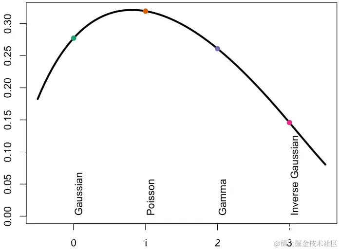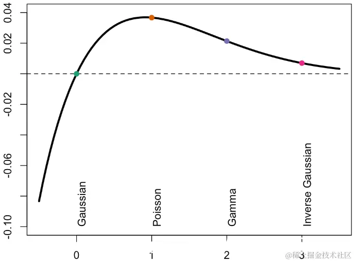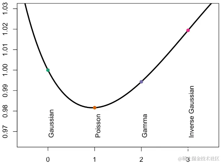 对于Gamma回归或高斯逆回归,由于方差是预测的幂,因此,如果预测较小,则方差应该较小。因此,在图的左侧,误差应该较小,并且方差函数的功效更高。