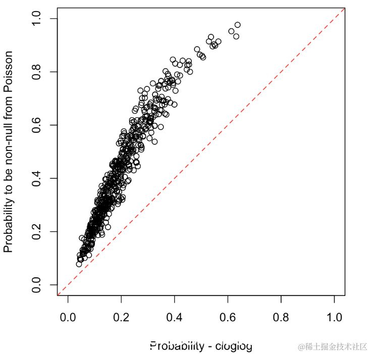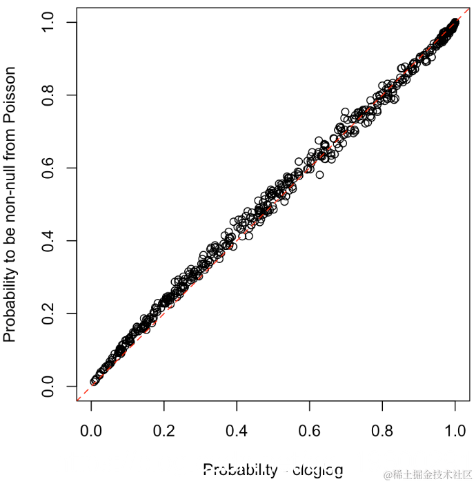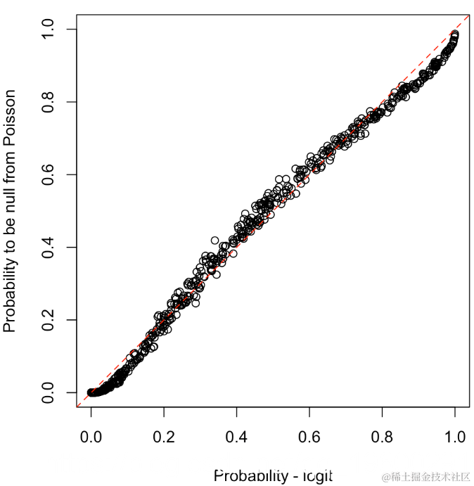abline(a=0,b=1,lty=2,col="red")