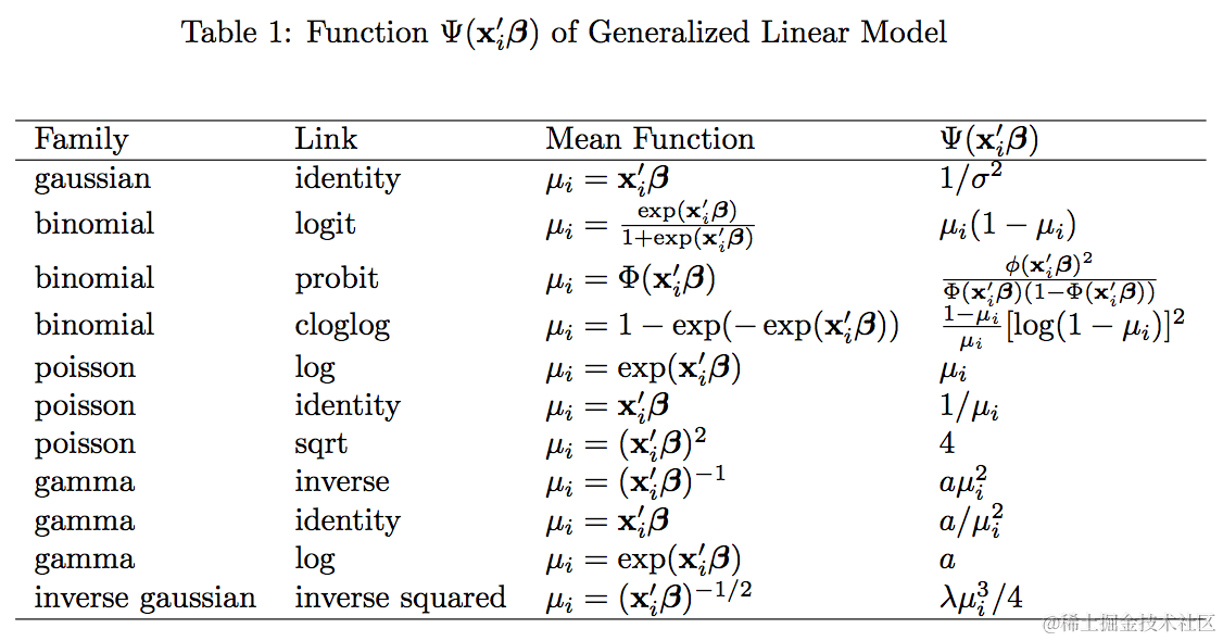 广义线性模型(GLM) 是通过连接函数,把自变量线性组合和因变量的概率分布连起来,该概率分布可以是高斯分布、二项分布、多项式分布、泊松分布、伽马分布、指数分布。连接函数有: