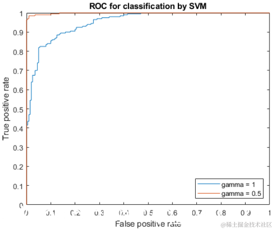 伽玛设置为0.5时曲线下的面积大于伽玛设置为1时曲线下的面积。这也证实了伽玛参数值为0.5会产生更好的结果。为了直观比较这两个伽玛参数值的分类性能。