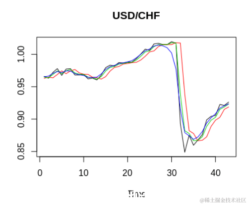 > ts.plot(ts(exp(currency[1232:1274]), exp(out$a[1232:1274]), exp(out$att[1232:1274]), exp(out$alpha[1232:1274])