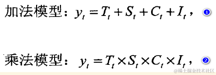 一般的,一个时间序列{yt}可以直接或经过函数变换后分解为如下的加法模型或乘法模型形式: