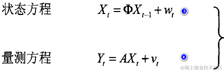 状态方程描述动态系统的状态从前一时刻到当前时刻的变化规律,而量测方程描述观测值和系统的状态之间的变化关系.Φ称为状态转移矩阵,A为量测矩阵,wt是状态噪声,vt是量测噪声(一般可设为正态白噪声)。