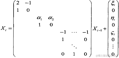 只要确定出趋势项(趋势差分数k)、循环项(循环项AR模型的阶数p)、季节项(季节阶数L,d),就可以方便的写出相应的状态空间模型。k=2,p=2,d=1时,例子如下: