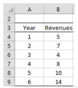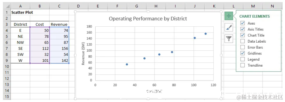 示例3:创建图5的范围A3:C9中所示的(x,y)对的散点图。此处,这些对代表 以百万美元为单位的每个收入(y值)和运营成本(x值)。零售业务的六个部门。