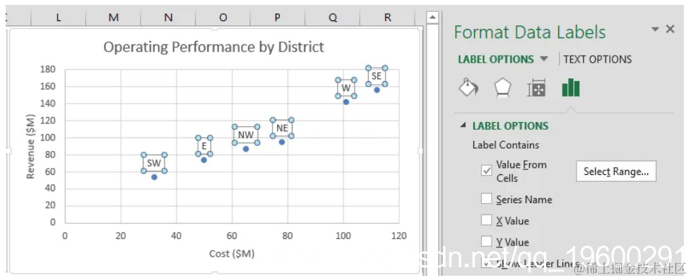 如果要添加标签,请使用适当的区域名称在图表中的每个点上单击图表。这将弹出图5图表右上方所示的三个图标。单击 + 图标,然后单击Data Labels 图表元素选项的右侧 。在出现的菜单上,选择“ 更多选项...” 选项。这将弹出一个菜单,如图6的右侧所示。取消选中 Y Value 选项,然后选中 Value from Cell 选项。在出现的对话框中,输入范围A4:A9(包含地区名称),然后按 OK(确定) 按钮。图表现在将包含地区名称标签,如图6左侧所示。