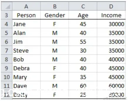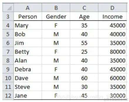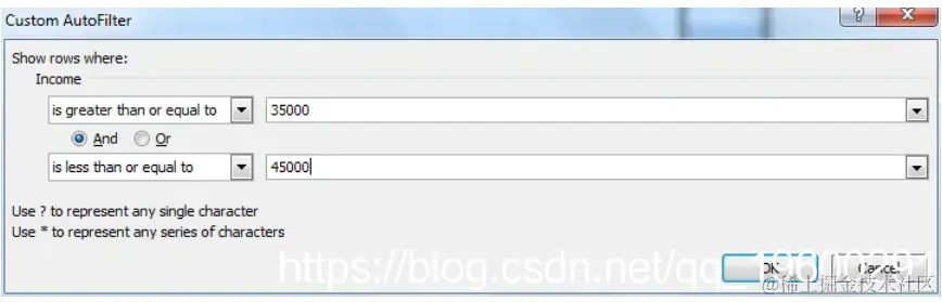 示例3:从图1的数据中提取所有收入在35,000到45,000(含)之间的人。
