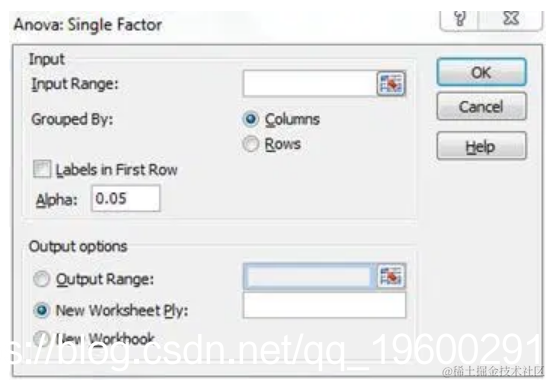 这些选项均代表一个数据分析工具,将在本网站上进行介绍。现在以示例方式假设您选择 Anova:Single Factor。现在将显示如图2所示的对话框。