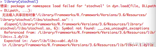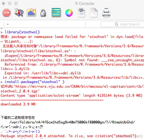 我需要安装R软件包stochvol,该软件包 仅适用于3.6.0版的R。因此,我安装了R(3.6.0 版本),并使用打开它 RStudio。但是现在 ,即使我成功 使用来 安装软件包,也无法加载任何库 。具体来说,我需要加载的库是stochvol ,Rcpp和 caret。我尝试重新安装 R, 但仍然无法正常工作。