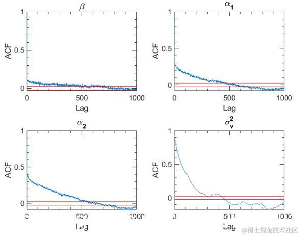 图8.预烧期后参数序列的自相关。红线表示5%的显着性水平。