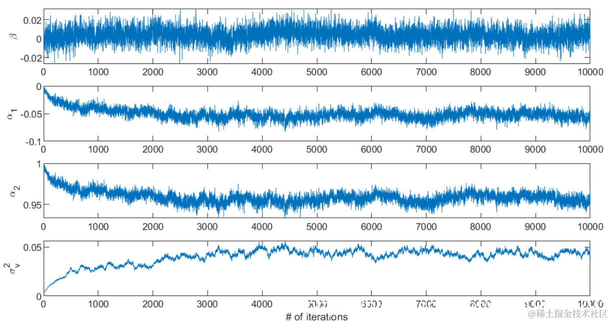 根据问题和设置,MCMC在序列接近目标分布之前可能需要进行多次迭代。如图7所示 beta快速达到稳定状态。稳定性之前的这些迭代称为“预烧期”。我们运行10000次迭代。
