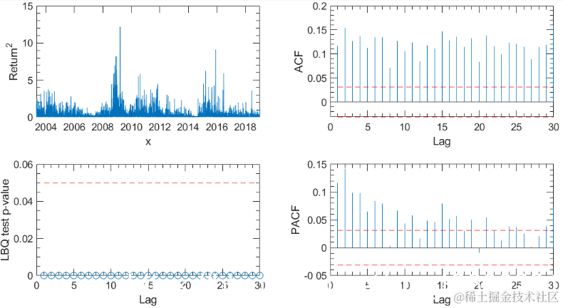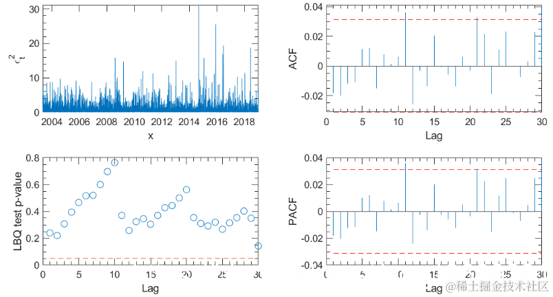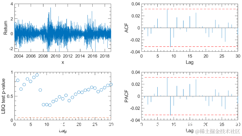 图2.收益相关性检验。Ljung-Box Q检验(左下方)未显示出明显的自相关。自相关函数(右上)和偏自相关函数(右下)(红色虚线为95%置信区间),表示没有相关性。