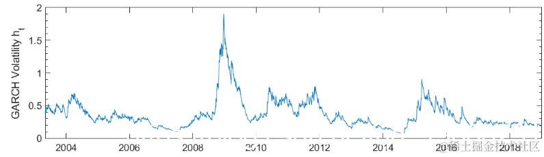 可以使用Matlab来估算GARCH(1,1)模型。图4和5中的ACF,PACF和Ljung-Box Q检验未显示出残差中的显着序列相关性,图4左上方的残差项比原始收益序列更像白噪声。然后可以认为GARCH(1,1)模型足以描述收益率的波动性(图6)。