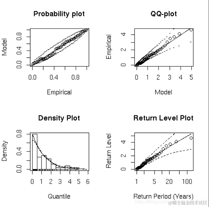 POT软件包可以执行单变量和双变量极值分析;一阶马尔可夫链也可以考虑。例如,目前使用18个 估算器拟合(单变量)GPD 。这些估算器依靠三种不同的技术: