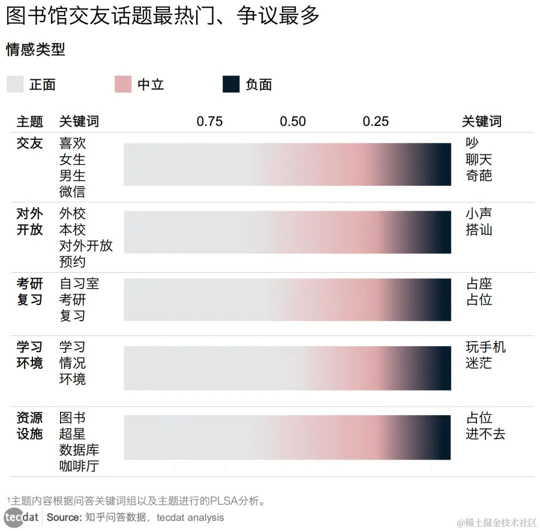 我们从评论数量、被关注度和赞同数量来评估用户的参与程度,可以看到图书馆交友话题(主题1)关注人数和赞同人数最多(如图书馆怎么认识女生?),其次是考研、复习(主题3)的相关话题(如图书馆应该为考研学生提供特权吗?),该话题下讨论的人数最多。接下来是学校图书馆对外开放(主题2)的话题(如公办大学的图书馆/自习室该不该对外开放?)和学习环境话题(主题4)(如本部图书馆内部环境设置怎么样,在同类高校中是属于很陈旧的还是很现代化的?)。