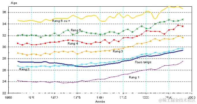 这些图形令人兴奋,特别是在过去30年中观察到的增长方面,这使我想到了寿命的增长趋势。我们可以找到其他有趣的数据(在这种情况下为平均 出生年龄 )。
