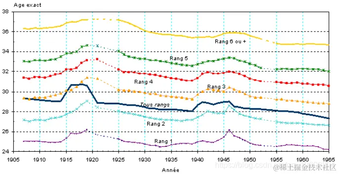 昨天上午,我们获得了分娩产妇的平均年龄两个图表,根据孩子的出生顺序排序,区间是1905-1965年: