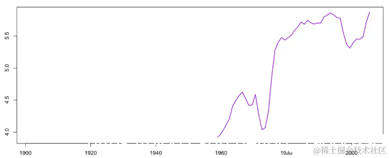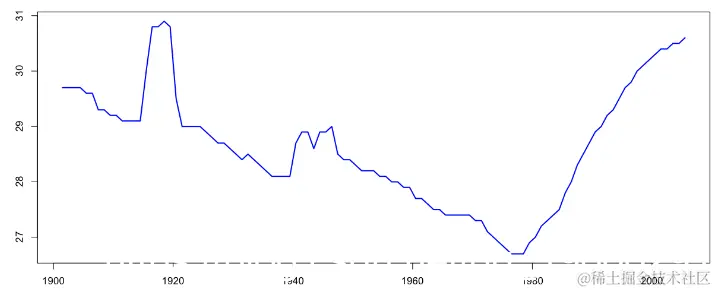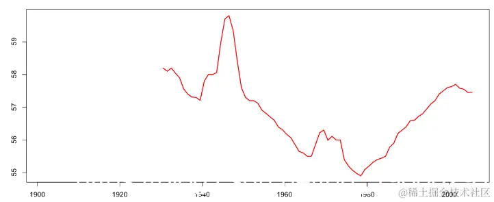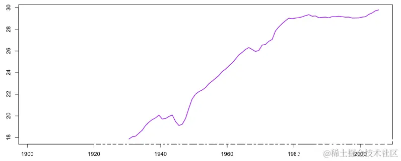 > plot(age$ANNEE+.5,age$age.GRD.MERE,
