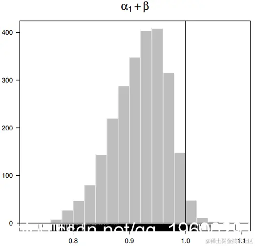 为了推断平方过程的持久性,我们仅使用后验样本,并为后验样本中的每个绘制y [j]生成(a1 [j] + b [j])。持久性的后部密度绘制在图4中。直方图向左倾斜,中值为0.923,最大值为1.050。假设a1 + b <1,则GARCH(1,1)模型的无条件方差为a0 /(1- a1- b)。条件是存在时,后验均值为0.387,90%可信区间为[0.274,1.378 ]。经验方差为0.323。