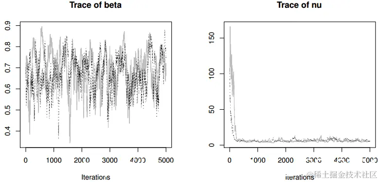 作为贝叶斯估计的先验分布。通过设置控制参数值n.chain = 2和l.chain = 5000,我们为5000次传递生成了两条链。