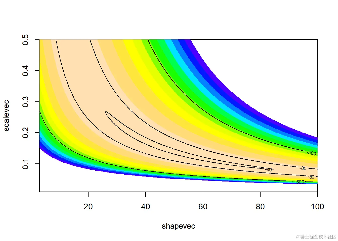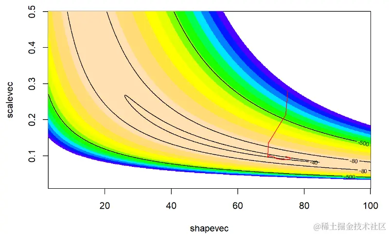 contour(x=shapevec,y=scalevec,z=surface2D,levels=c(-30,-40,-80,-500),add=T)