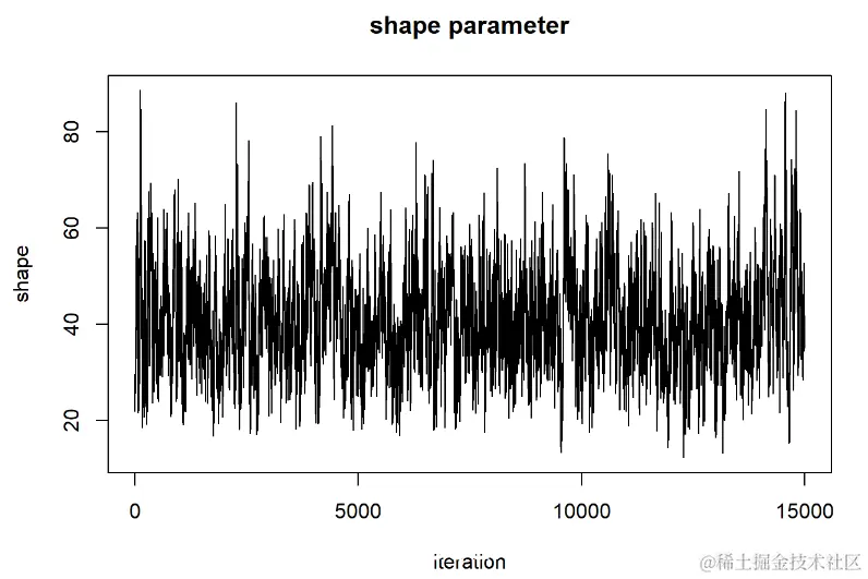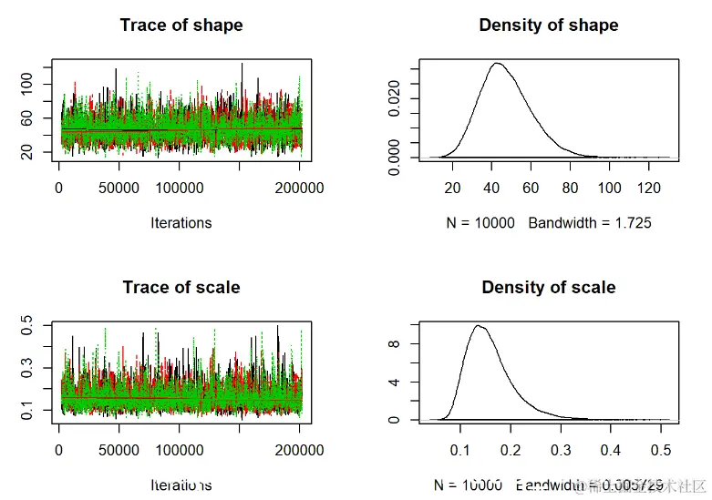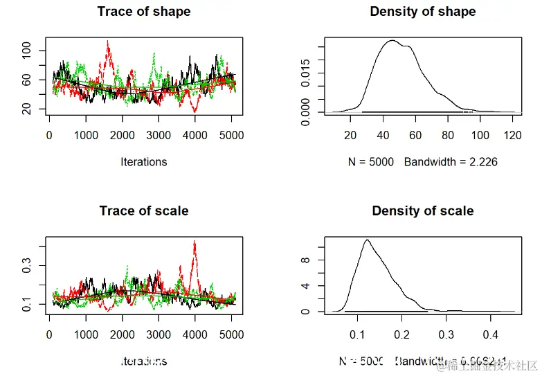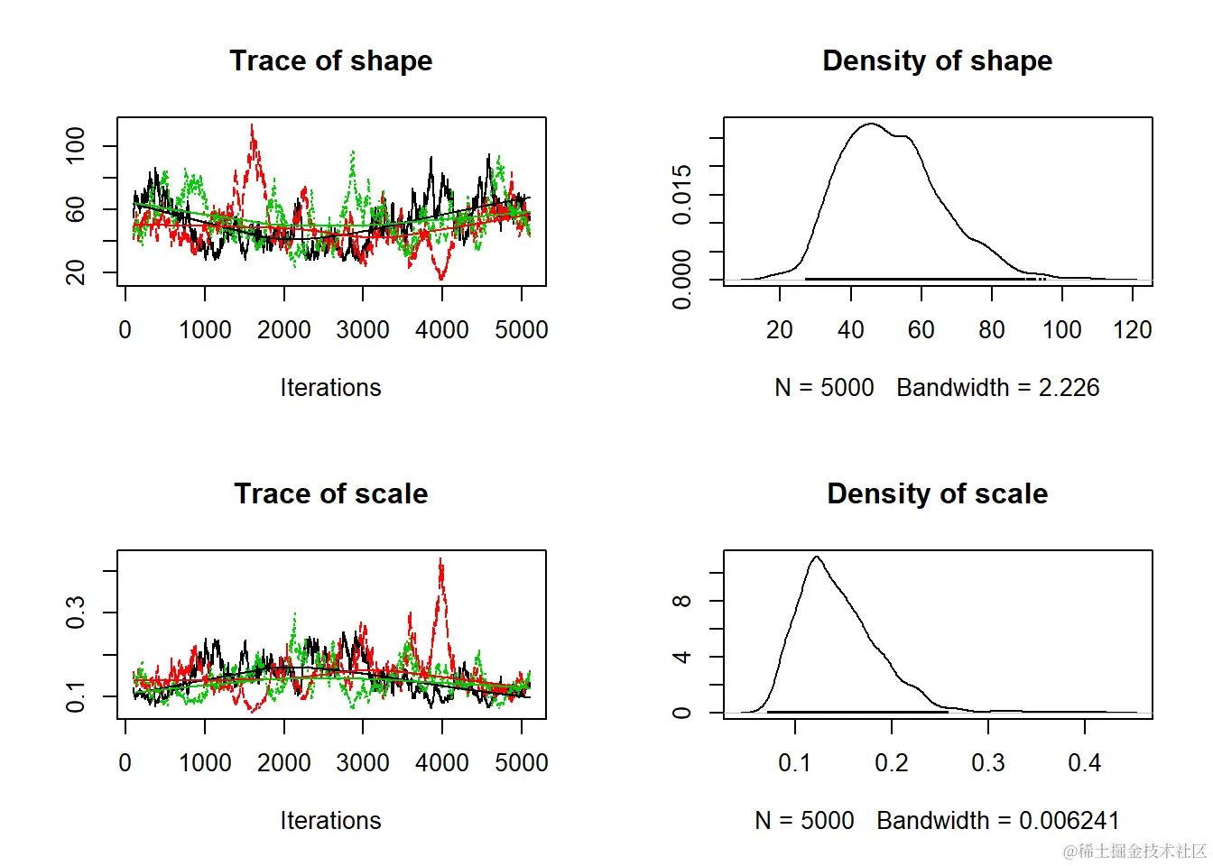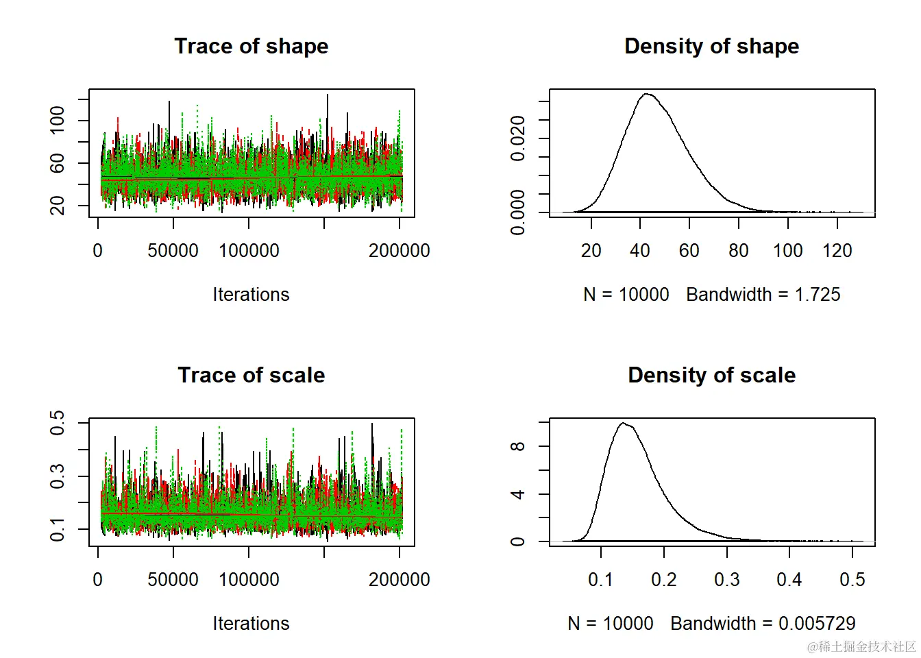 - 当视为“轨迹图”时,每个参数的链应看起来像白噪声(模糊的毛毛虫)或类似的噪声