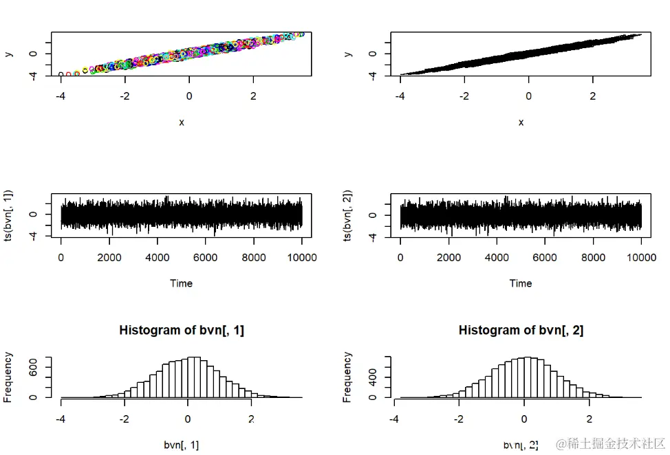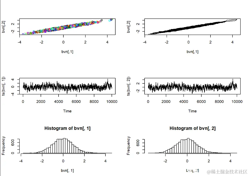 请记住,MCMC采样器只是随机数生成器的一种。我们可以使用Metropolis-Hastings采样器来开发自己的随机数生成器,生成进行简单的已知分布。在此示例中,我们使用MH采样器从标准双变量正态概率分布生成随机数。