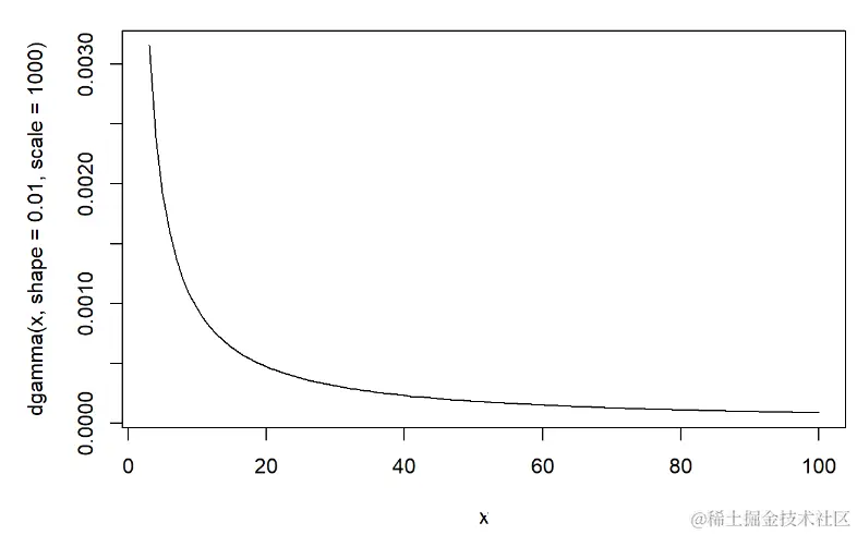 然后,我们需要预先分配参数!在这种情况下,我们分配gamma(shape = 0.01,scale = 100)和gamma(shape = 0.1,scale = 10)的分布(均值为1且方差略低):