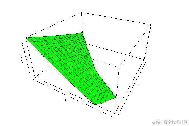 persp3d(temp, temp, z,col='green',xlab='x',ylab='y')
