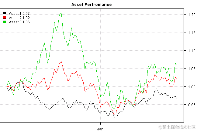 plota.matplot(scale.one(xts.prices),main='Asset Perfromance')
