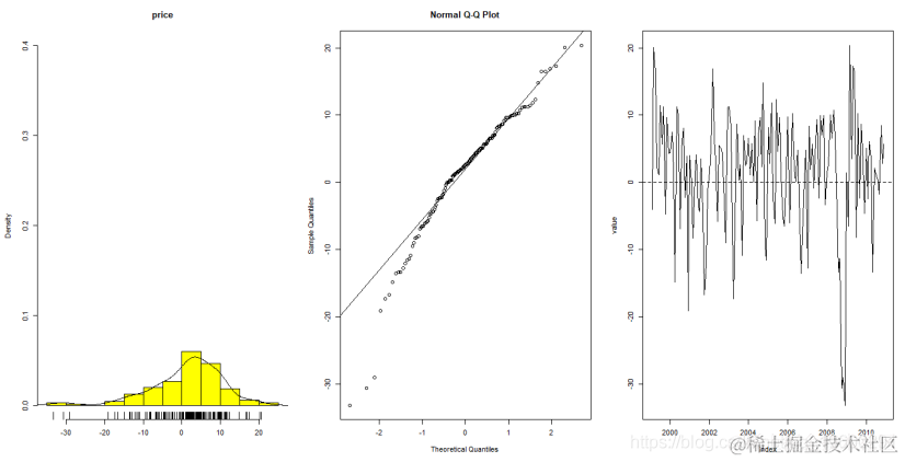 先检验数据正态性,可以计算得出数据分布函数,QQ图,对数收益率序列折线图