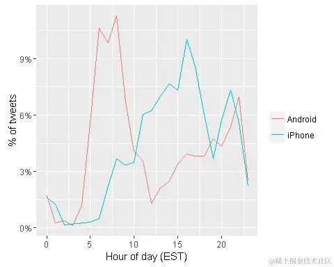 从对比图中我们可以发现,安卓手机和苹果手机发布推特的时间有显著的差别,安卓手机倾向于在5点到10点之间发布推特,而苹果手机一般在10点到20点左右发布推特。同时我们也可以看到,安卓手机发布推特数量的比例要高于苹果手机。