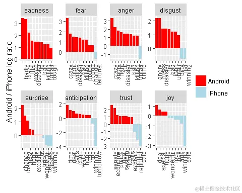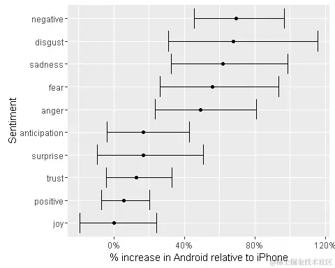 在统计出不同情感倾向的词的数量之后,绘制他们的置信区间。从上面的图中可以看到,相比于苹果手机,安卓手机的负面情绪最多,其次是厌恶,然后是悲伤。表达积极的情感倾向很少。
