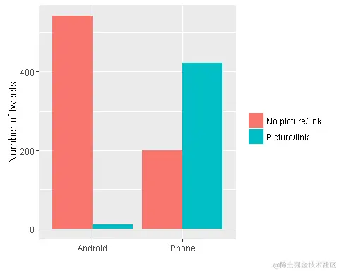 同时可以看到安卓平台的用户把推特一般不使用图片或者链接,而苹果手机的用户恰恰相反。