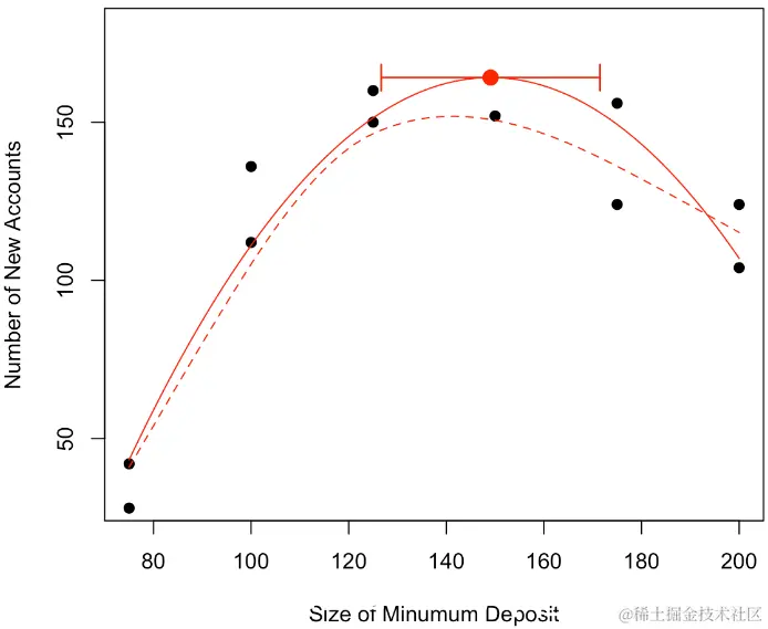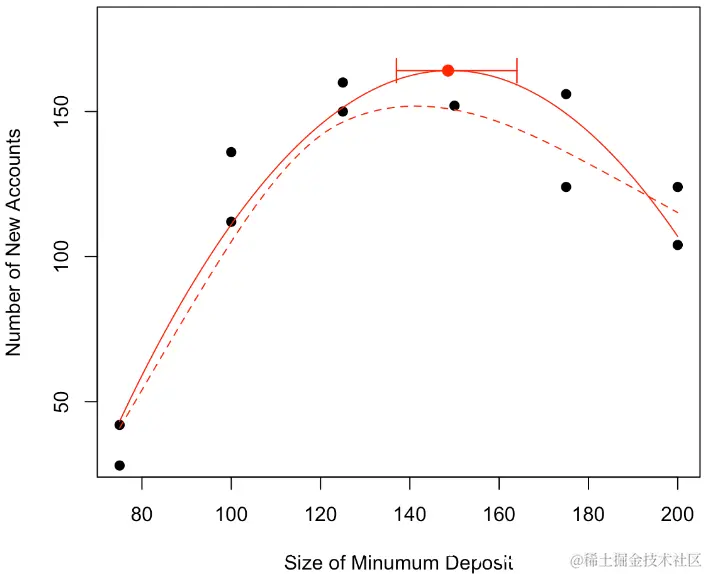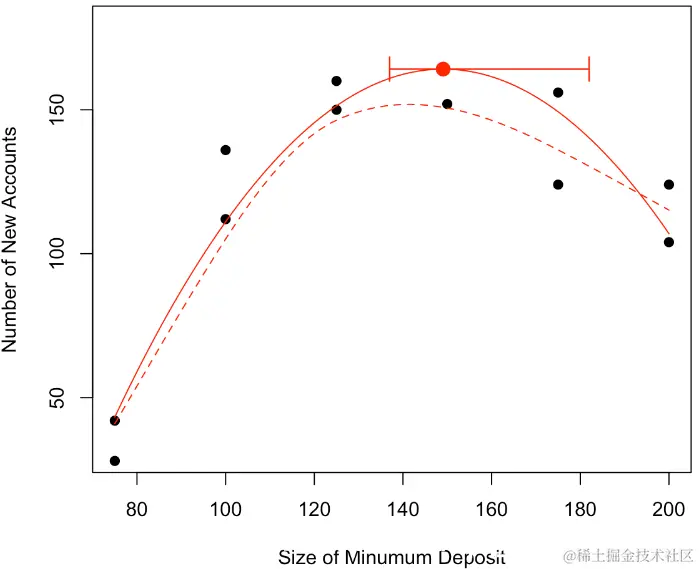 现在我们可以证明,对于形式为y =β2x2 +β1x +β0的抛物线,最优值以x⋆=θ= −β1 /2β2来获得。那么θ的自然估计量就是θ= −β 1 /2β2,通过最小化误差平方和。但是如何获得该估计量的方差?通过考虑以下因素,我们自然可以尝试Delta方法