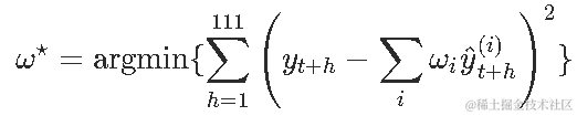 然后,我们可以尝试加权平均值来优化模型,而不是找出四个中的哪一个模型是“最优”,y ^ T = ∑iωiy ^ t(i)其中ω=(ωi),ω1+ ... +ωk= 1。然后,我们想要找到“最佳”权重。我们将在第一个m值上校准我们的四个模型,然后比较下111个值(和真实值)的预测组合,