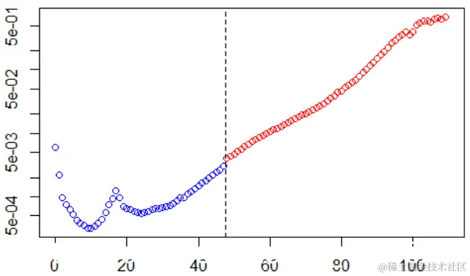 这个想法是Lee&Carter(1992)的初衷,我们可以尝试指数模型或线性模型(在1950年以后的原始K ^序列上)