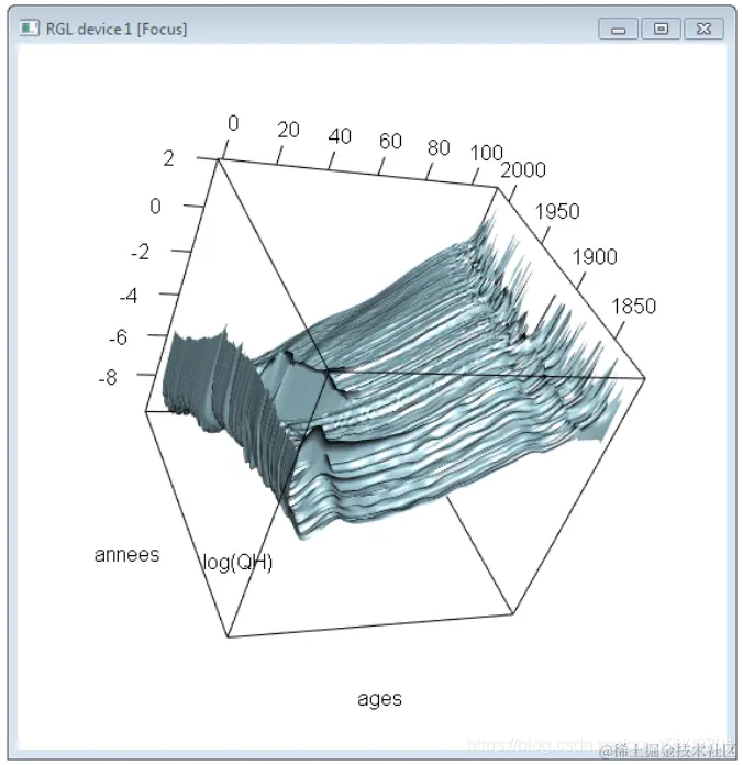 persp3d(ages,annees,log(QH),col="light blue")