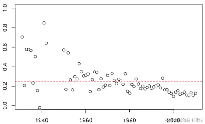 如果我们看一下变化,我们发现每年(大约)有0.25的变化