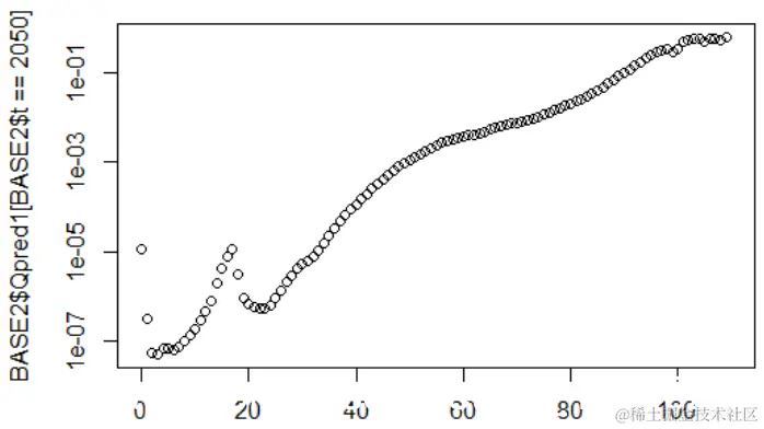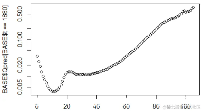 BASE2$Qpred1=exp(cste+BASE2$Ax+BASE2$Bx*BASE2$Kt1)