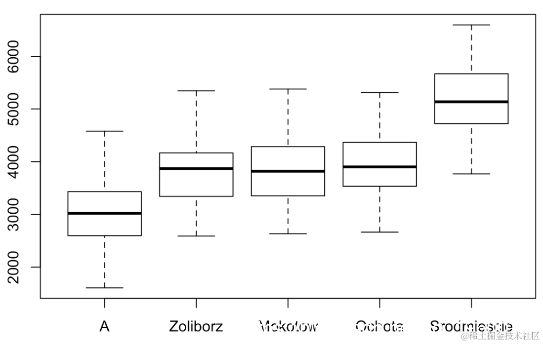 P为0. 17,我们可以接受原假设。然后,我们有三组地区,名称分别为A,B和C。我们获得以下框线图